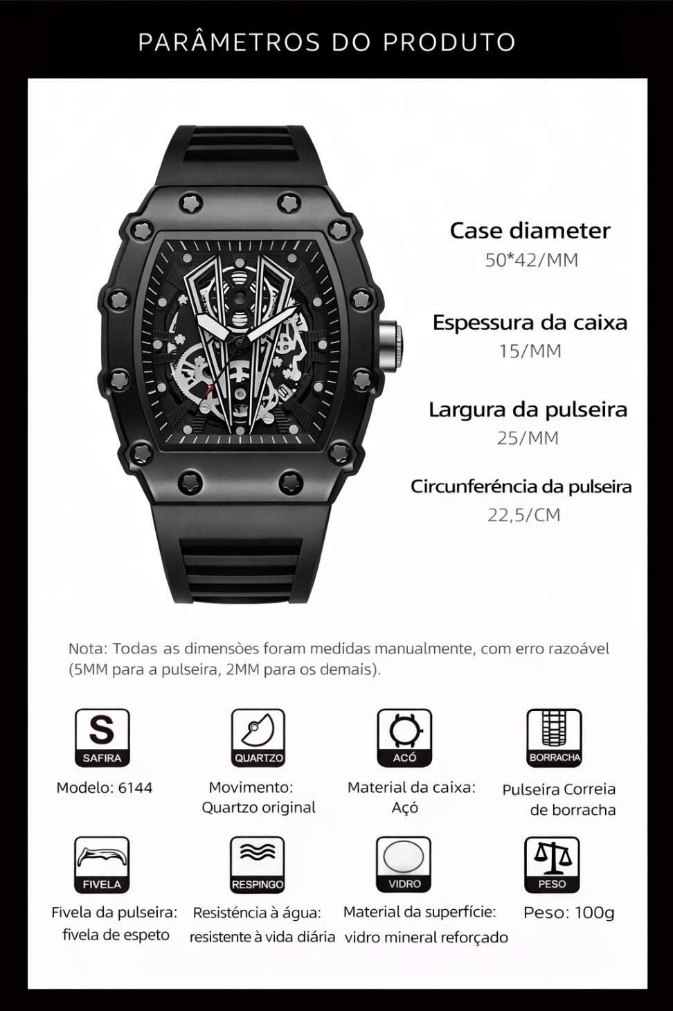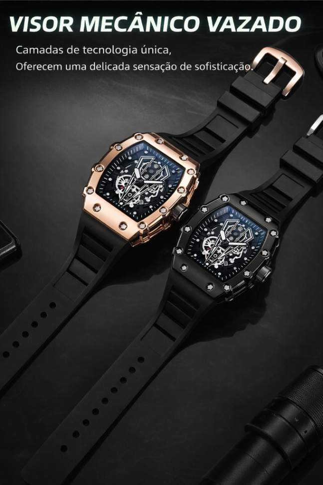 Caixa: Liga metálica com formato tonneau (capota) – moderna e robusta